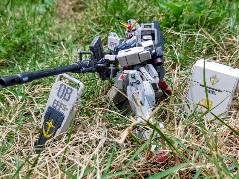 Of all of the builds I’ve done this year, this is probably one of my favorites. In my opinion, this kit is great for beginners and experienced builders alike; beginners will love all the panel line details crammed into this kit, and experienced builders will have a blast weathering and detailing this kit. This was my second attempt at weathering and I think it came out pretty well. This kit is perfect for weathering practice, since regardless of how badly you do, the ground Gundam SHOULD look pretty beat up in the end. Stick it outside, and it’ll make for a great photo shoot. Articulation and details are excellent with a lot of weaponry included. I dig the artillery cannon that can be folded up into the backpack. At the price point, I’d consider buying multiple ground gundams! I can’t wait to see more experienced builders and their takes on this kit/kitbashes. Kit review and build details following the image gallery. Enjoy!