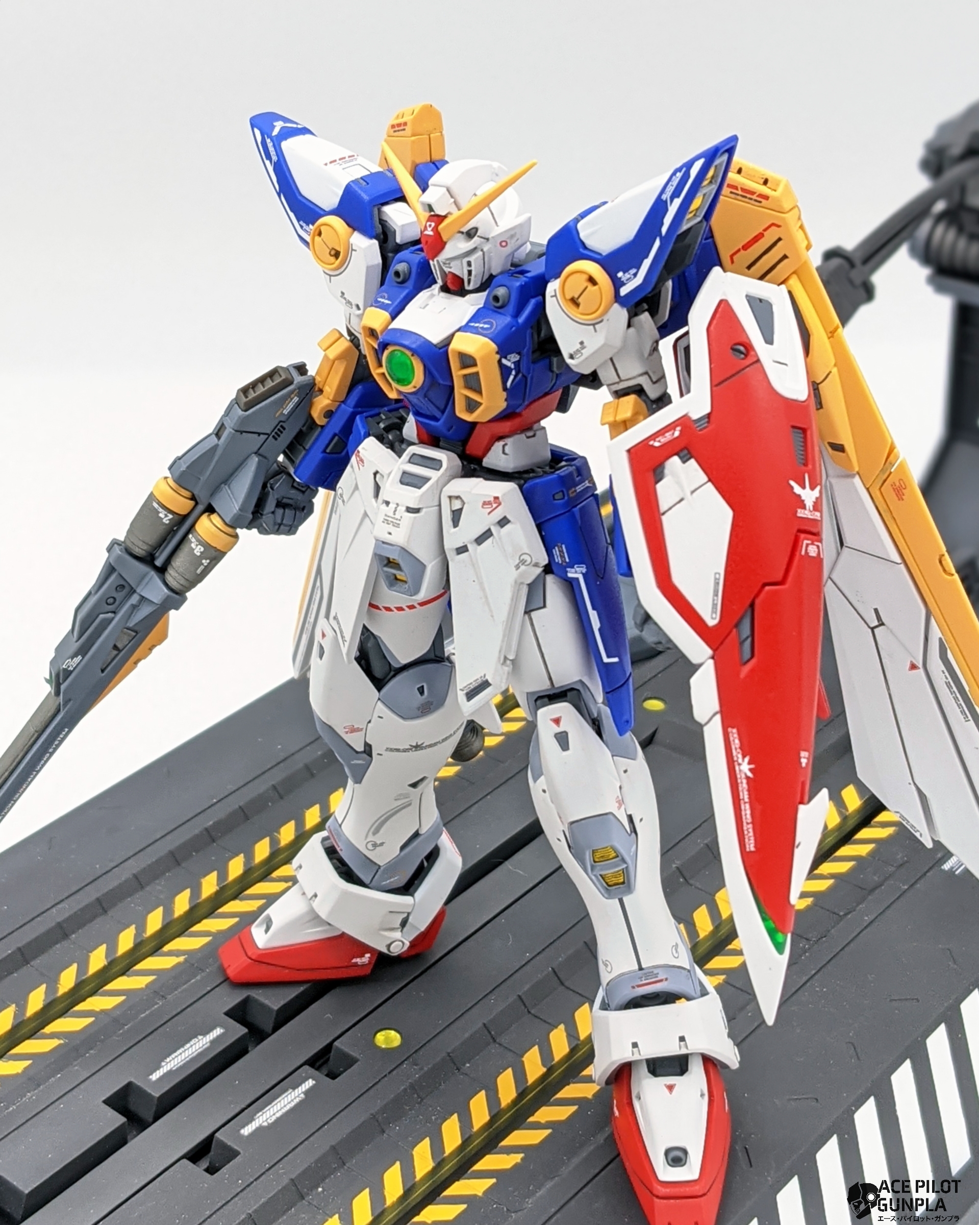 Though this kit has a cheaper price point than most of the recent RGs, it also has a few shortcomings. For starters, the “new” bird mode showed off in earlier promo pics isn’t even detailed in the instruction manual, and when you finally try it for yourself, it looks quite silly when taken from the wrong angle. The kit also skips out on a 2nd beam saber handle and the pilot figure while also giving you one of those “new” action base connectors. I don’t know why Bandai has started to include these bases rather than the traditional connectors, but the extra plastic and loose fitting connector, makes it more difficult to pose the connector in steep angles for those flight poses! That being said, the increased stiffness of the arm and leg joints make it possible for the Wing Gundam to hold up its heavy Buster rifle and pose the kit in dynamic poses which complement the increased wing span! It might be a slight oversight, but the extended legs are a much appreciated touch that stands out when you pose the kit next to its fellow RG kits. Overall, I’d recommend the kit especially for those of you into the Gundam Wing designs!